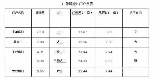 鲁班尺上的门洞吉数:若换算为公制尺寸,通常吉数尺度有21-23cm、40-42cm、60-62cm、81cm、88cm、89cm、106-108cm、126-128cm、133cm、146cm、155cm、171-176cm、191-198cm、211--216cm、 231-236cm、241cm、253-256cm、261-263cm、275cm、281-283cm。